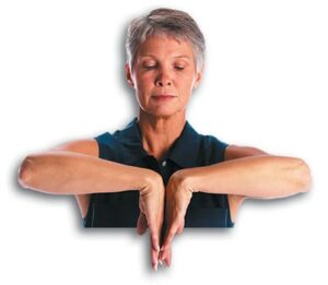 Place the backs of your hands together with fingers pointing down and arms parallel to the floor. Hold for up to one minute.